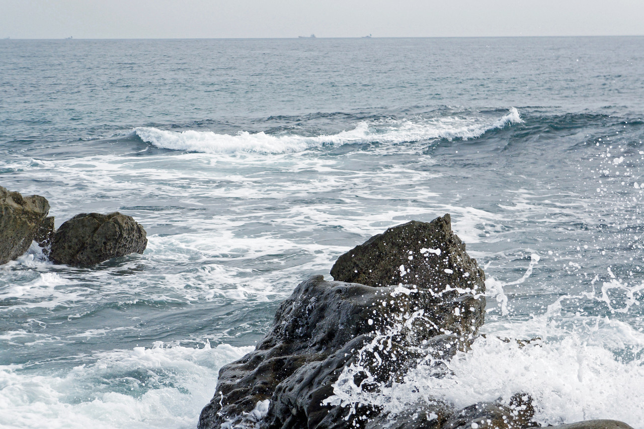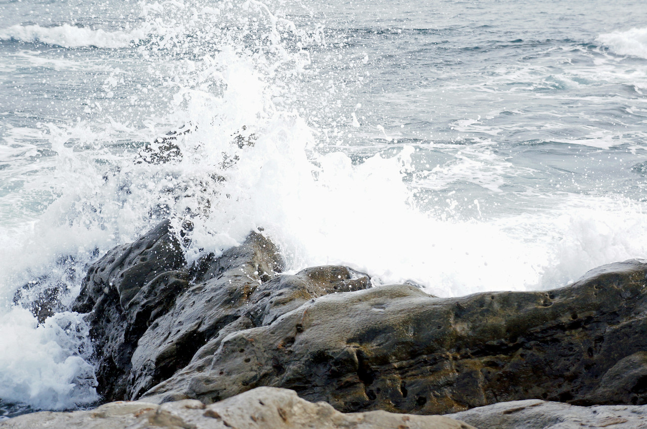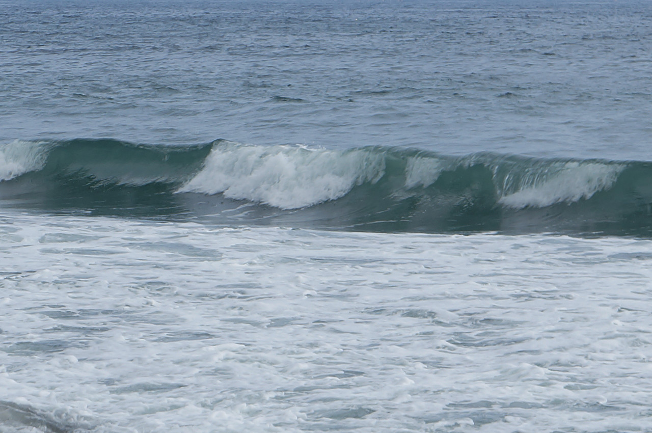 シャッタースピードを速くして、本当はバシャーっと跳ねる波飛沫(しぶき)を撮りたかった。しかし曇りで光が弱かったせいか波飛沫に立体感が出ず迫力のない結果に。私はけっこう濡れたのにクヤシイ。