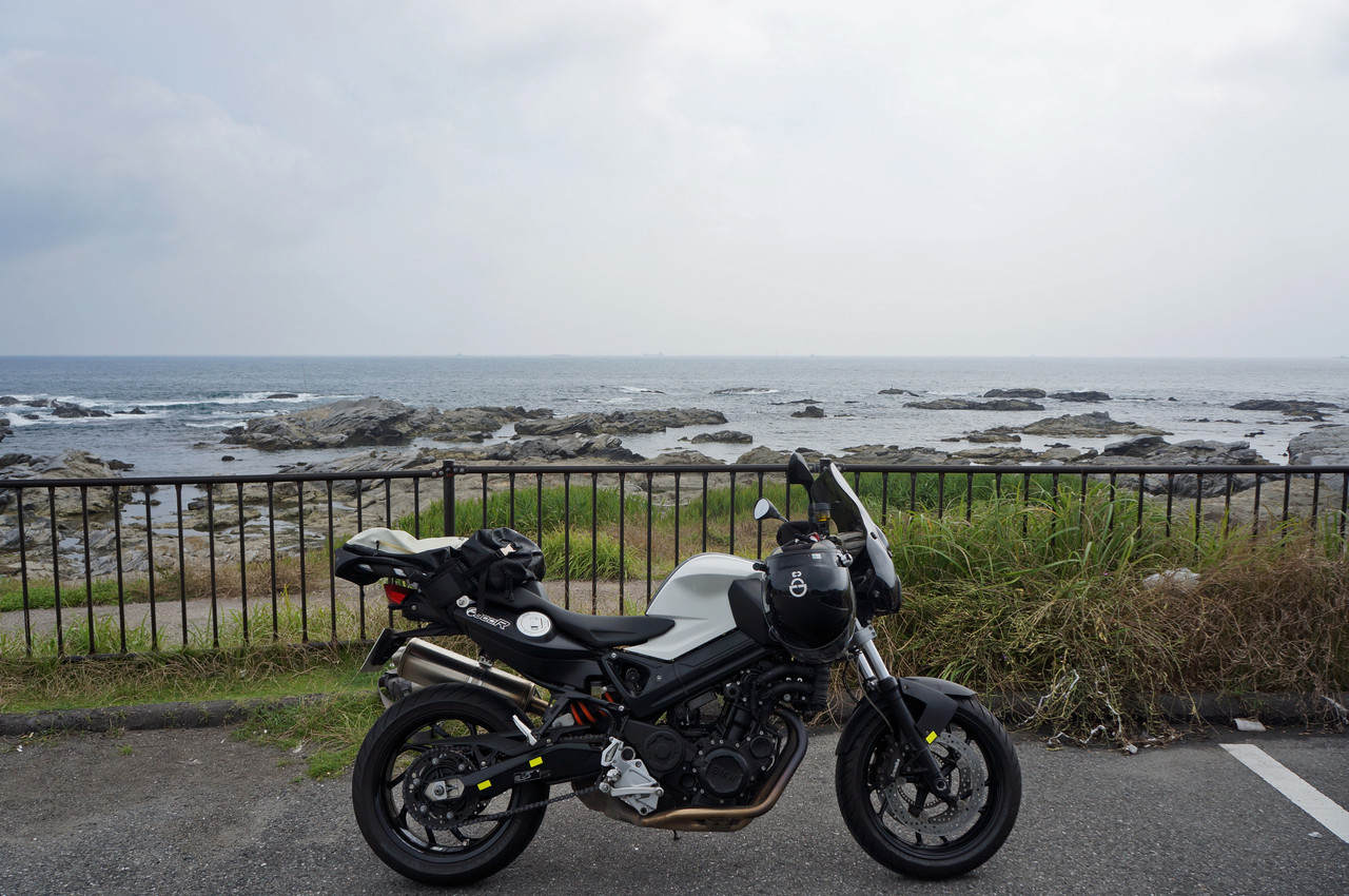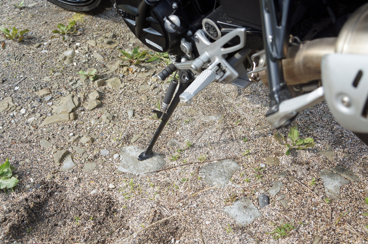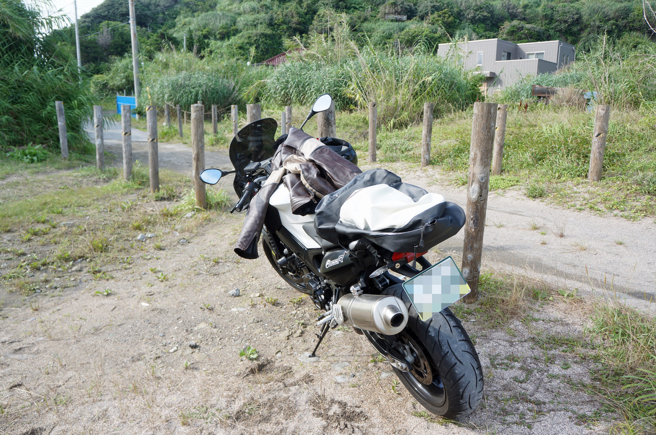とりあえず民宿の敷地でUターン。そして無料駐車場まで戻って、また海岸まで来るのは面倒だったから(歩いて3分ほど)、海岸と道路を区切っている杭の内側にコソッとBMW F800Rを駐める。けっこう傾いてヤバイ雰囲気。杭と杭の間が「Uターンできない」と警告されていた道。
