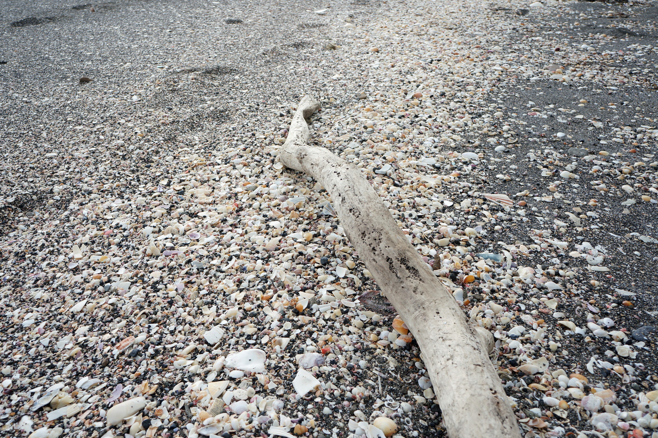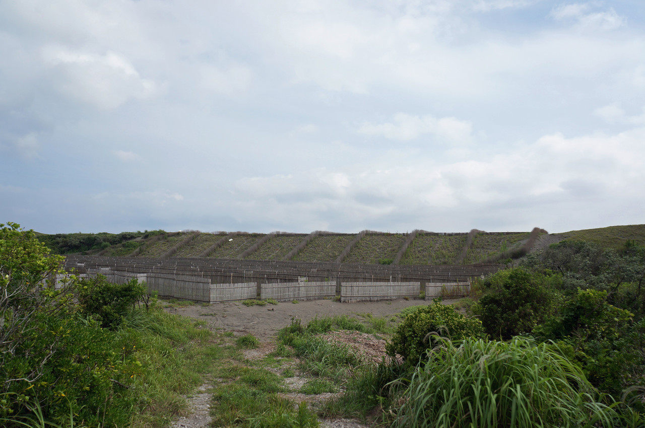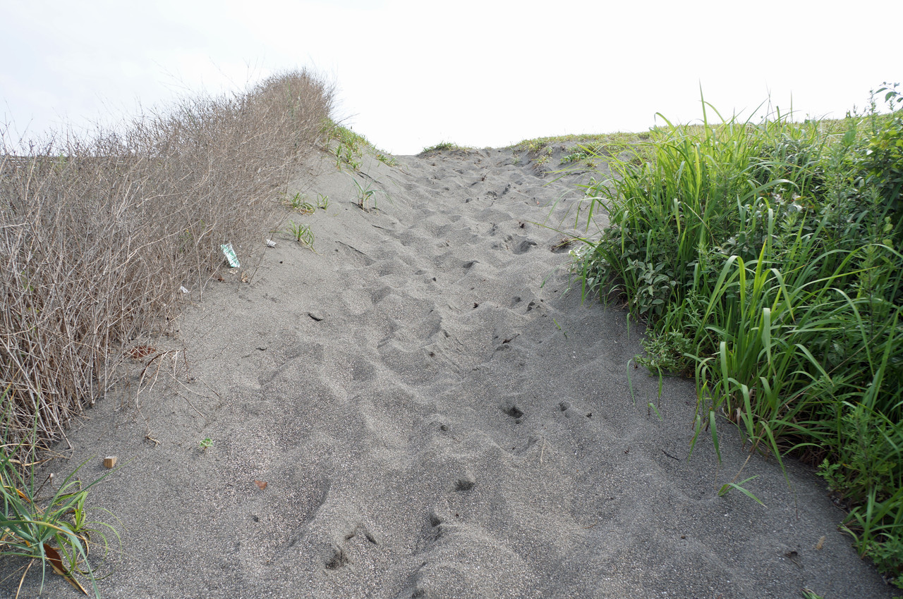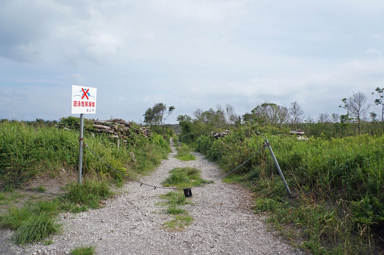 とりあえず民宿の敷地でUターン。そして無料駐車場まで戻って、また海岸まで来るのは面倒だったから(歩いて3分ほど)、海岸と道路を区切っている杭の内側にコソッとBMW F800Rを駐める。けっこう傾いてヤバイ雰囲気。杭と杭の間が「Uターンできない」と警告されていた道。