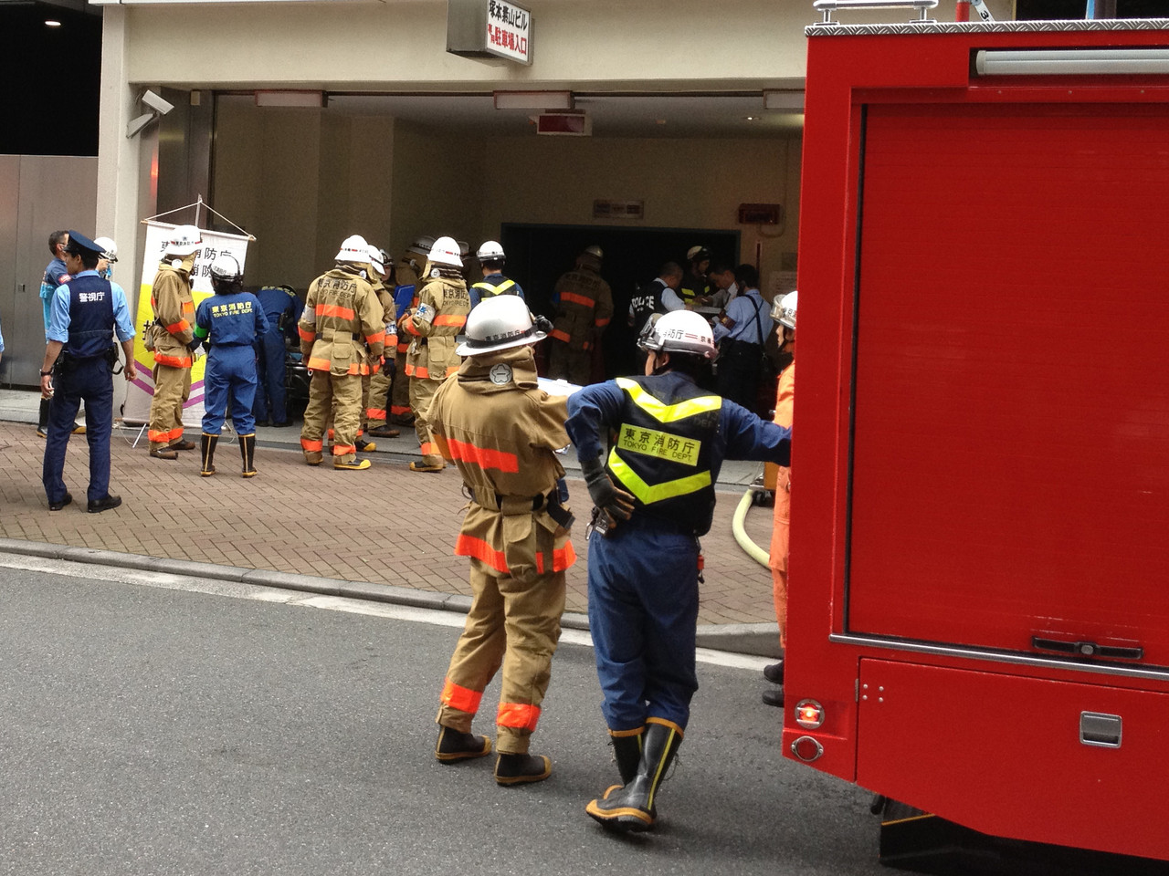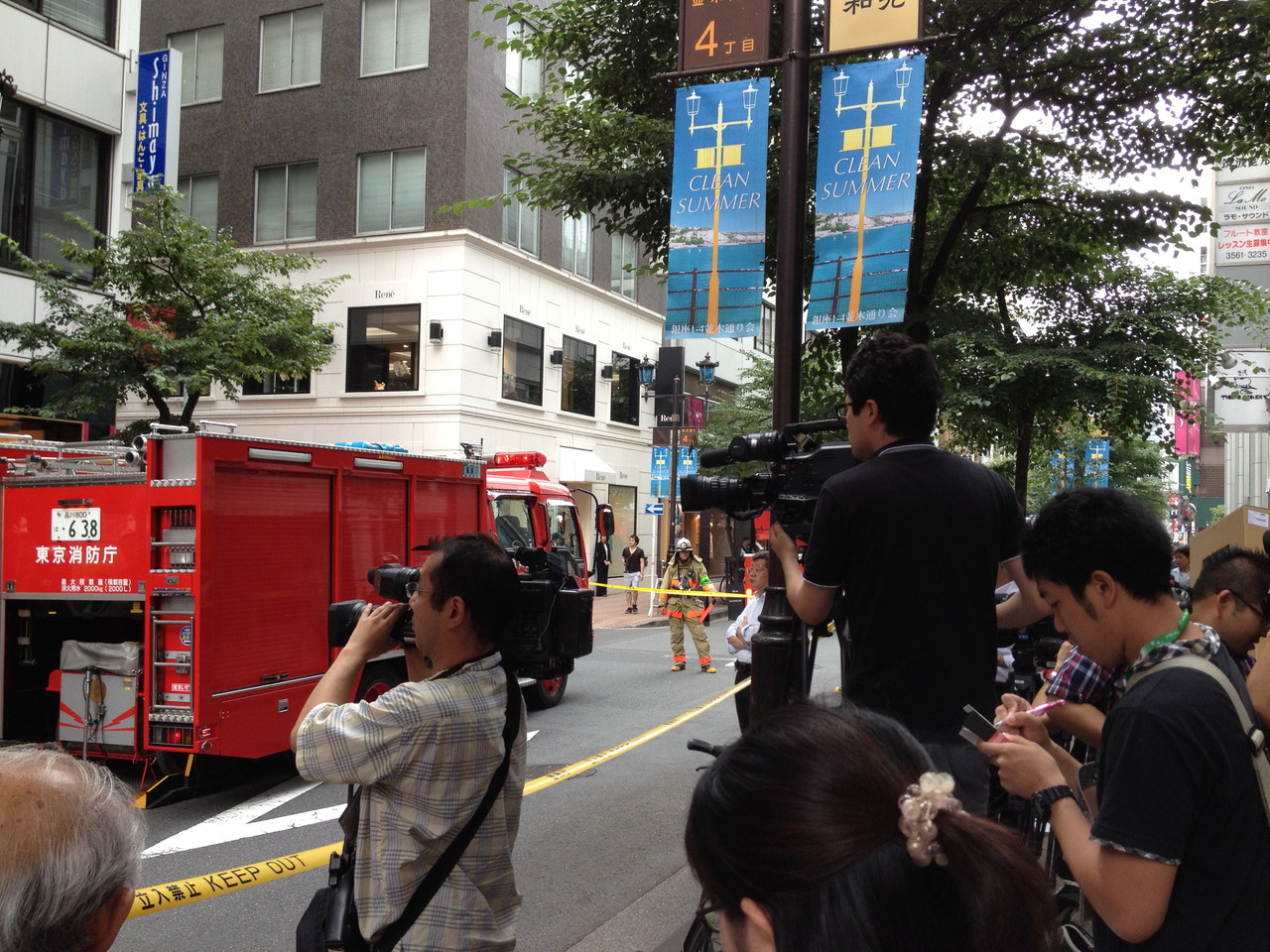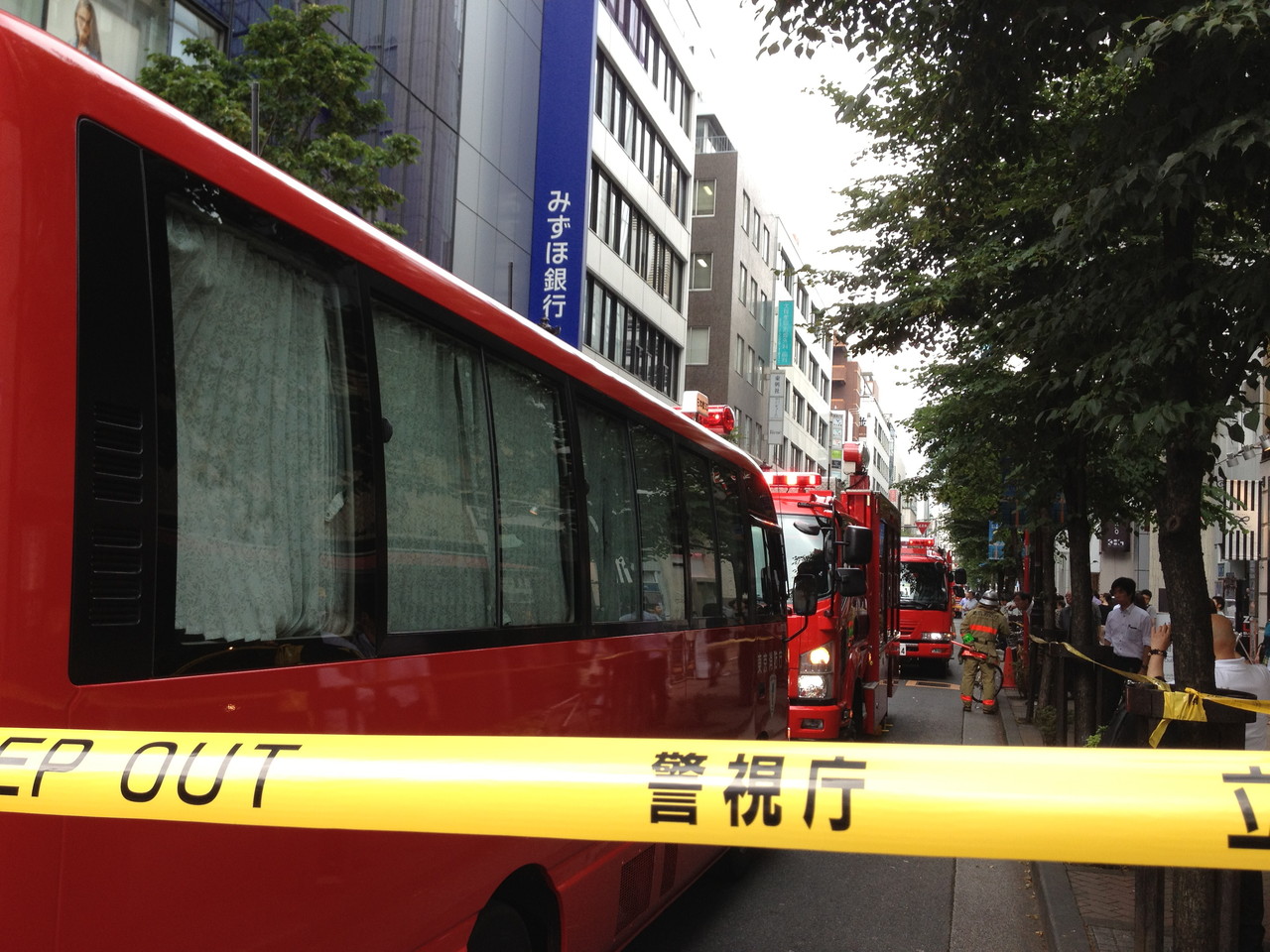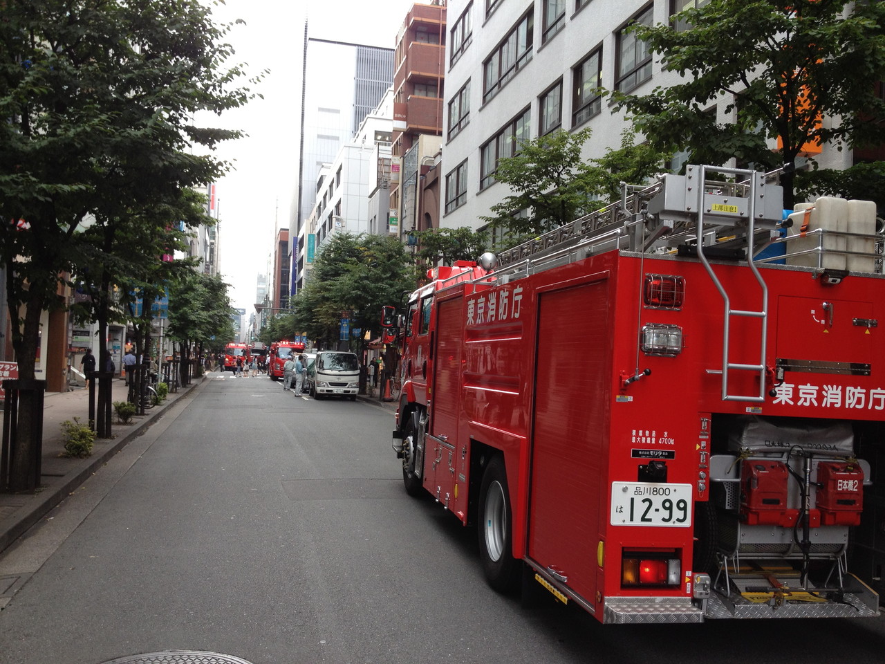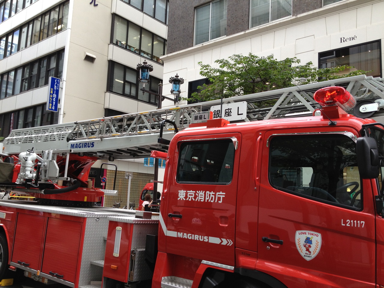 月曜日、お昼頃に地下鉄の銀座駅から地上に出て並木通りに入ろうとしたら、消防車が何台もいてビックリ。野次馬になってiPhoneで撮影する。