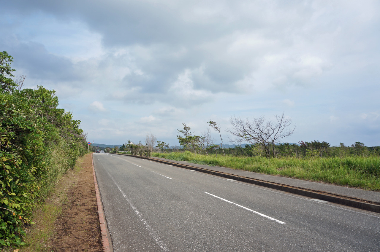 房総フラワーラインは4キロほど続く海沿いの直線道路。しかし防風林があって海は見えない。このあたりは海水浴場としては利用されておらず海岸に出る道もない。だからクルマやバイクを駐めておく場所も、道路沿いにあるホテルやゴルフ場の駐車場を別とすれば基本的にない。