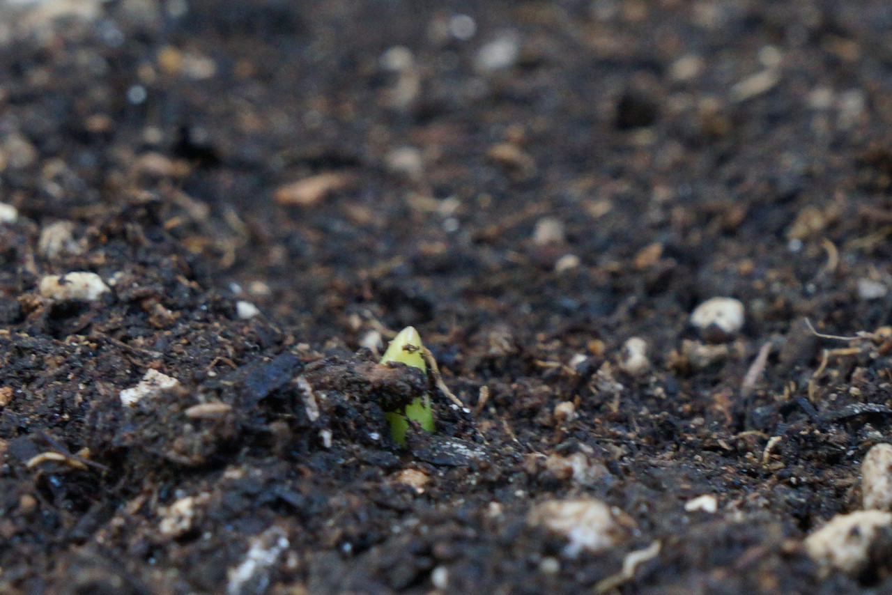 皮被りは手前の芽と同じ時期に発芽して似たような大きさだが、皮を被っていたせいかまだクチバシにはならず豆のまま。こんなどうでのいいような観察が意外と楽しいものである。