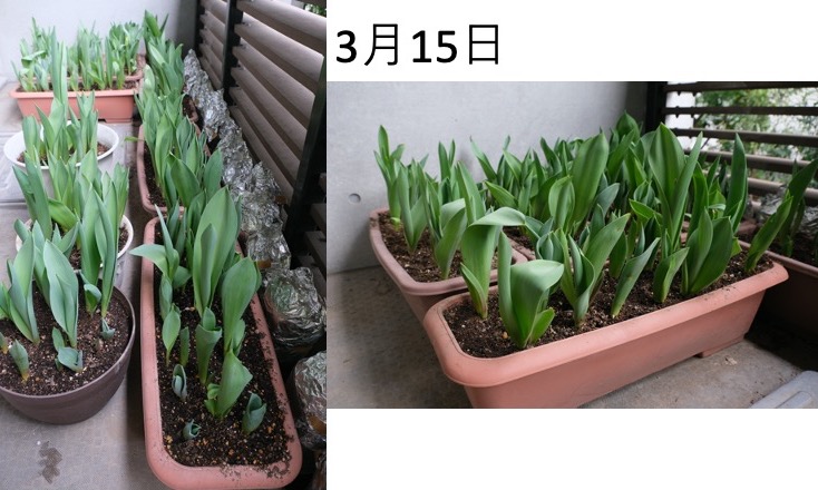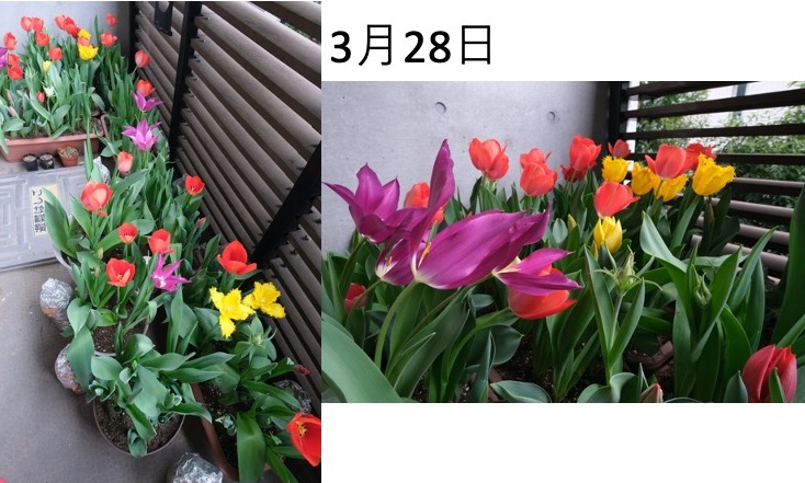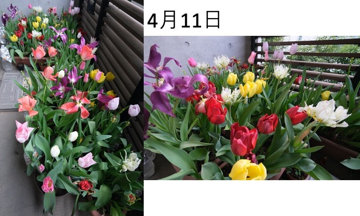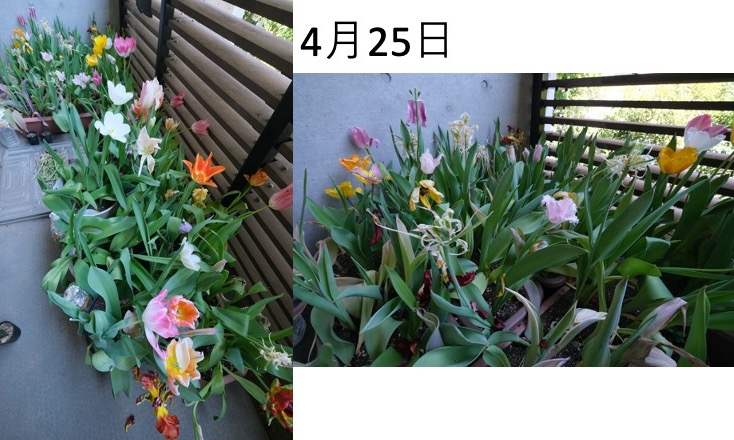 ピークは4月4日。別の品種でもう1回賑やかになるかと期待したものの、そこから徐々にフェードアウト。4月11日から25日は全体写真だとみすぼらしいが、個別に花を眺める分にはそれなりに楽しめた。