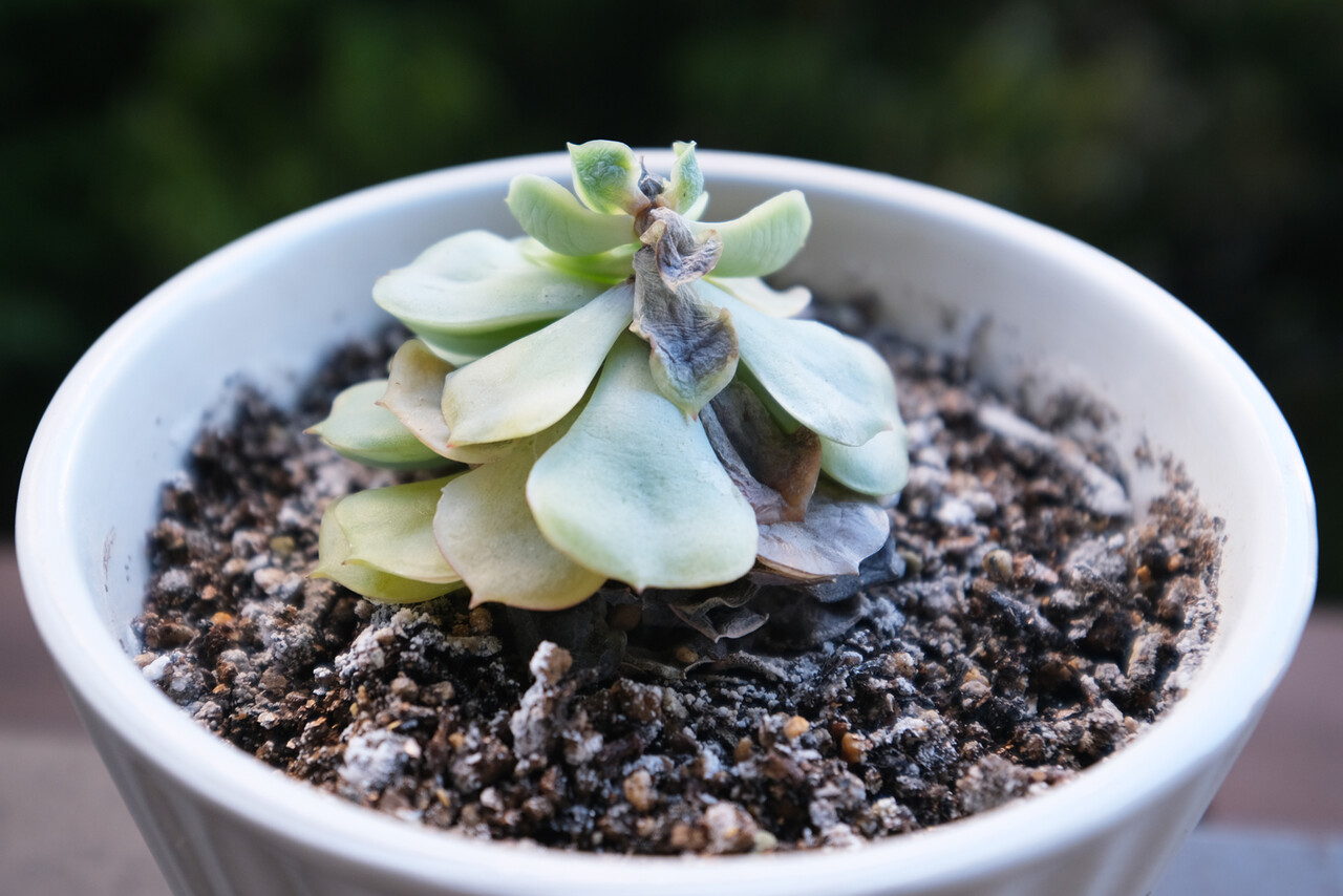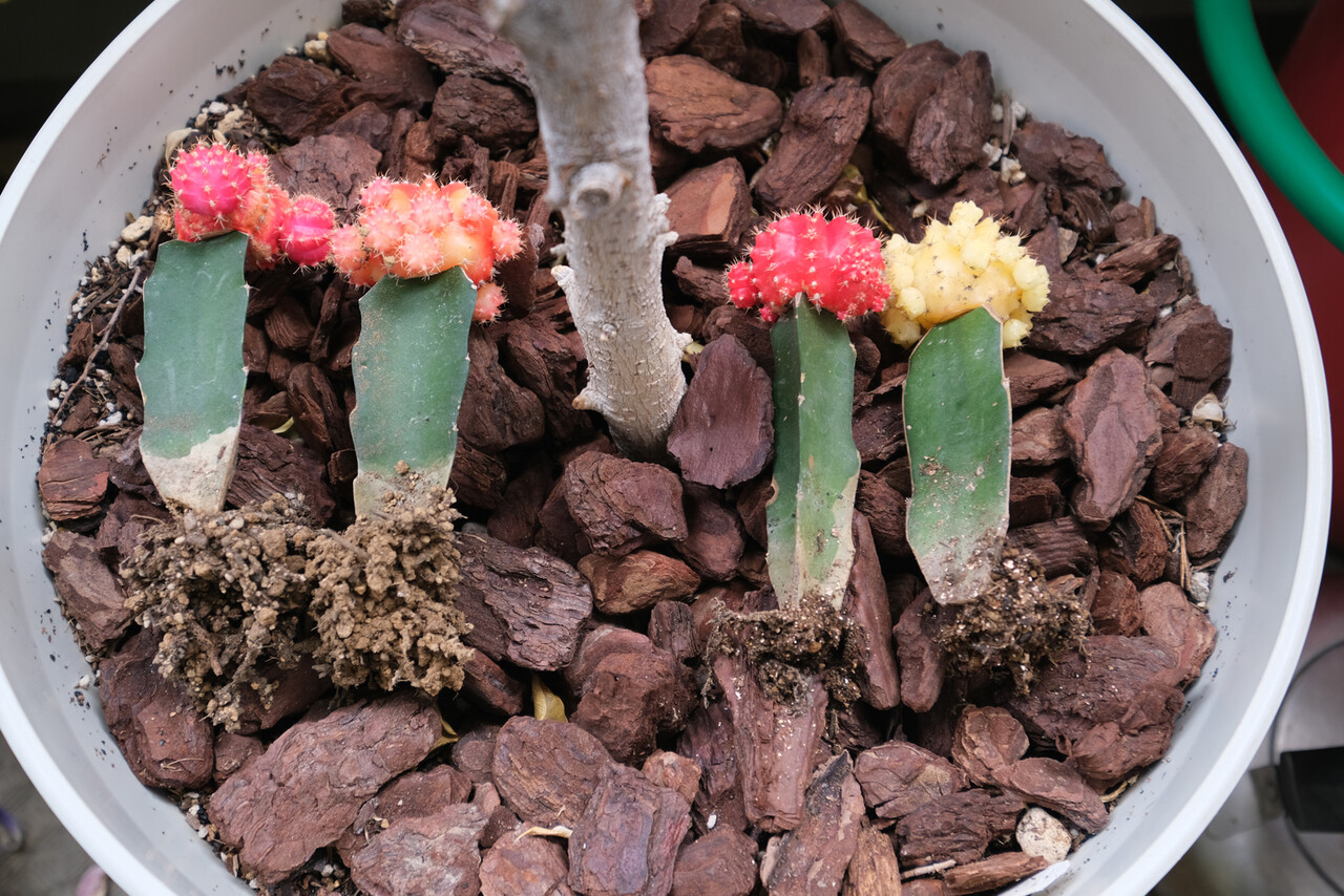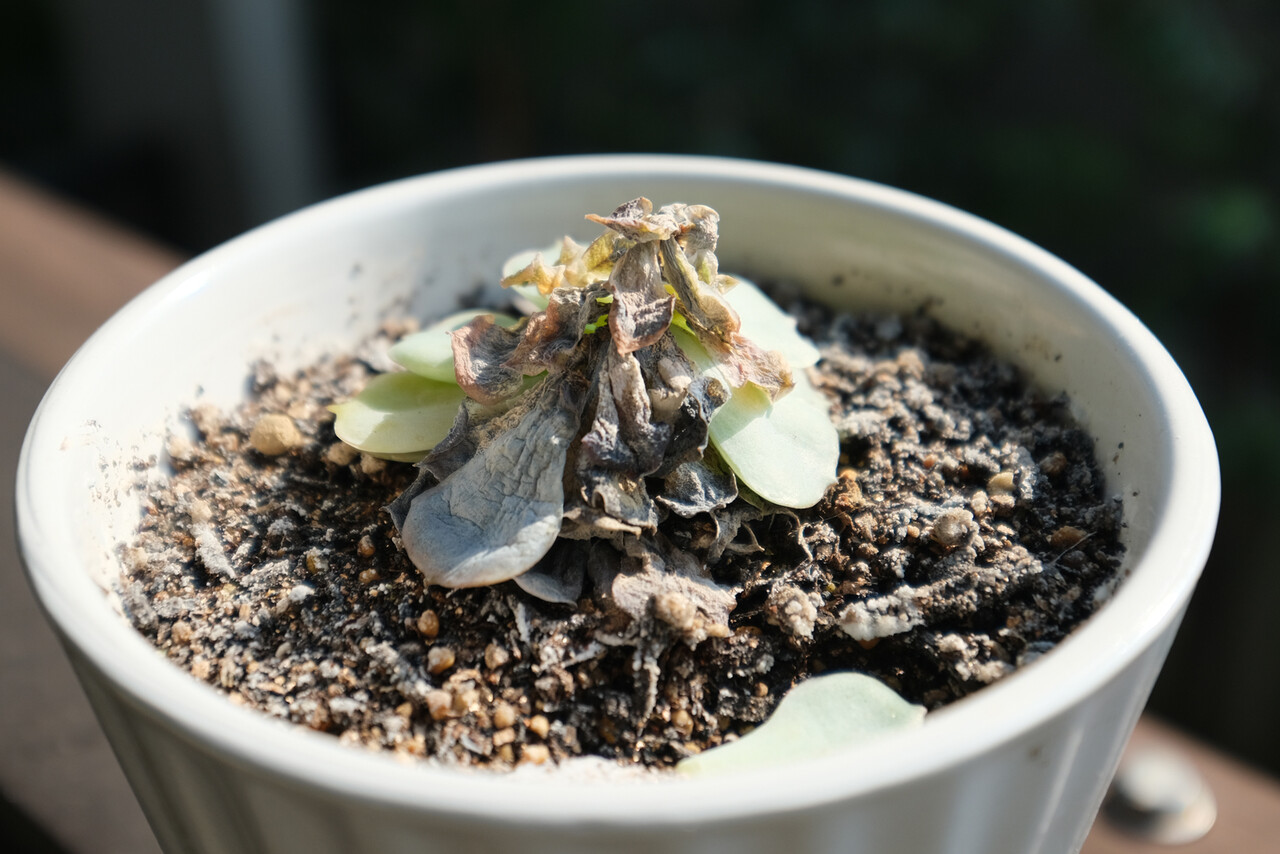 23日には魅惑の月以外の、金盛丸と緋牡丹のプランターには異常はなかったが、昨日には一部に白い結晶が見られた。もっとも魅惑の月が枯れた原因がこの結晶とは限らないのだが。
