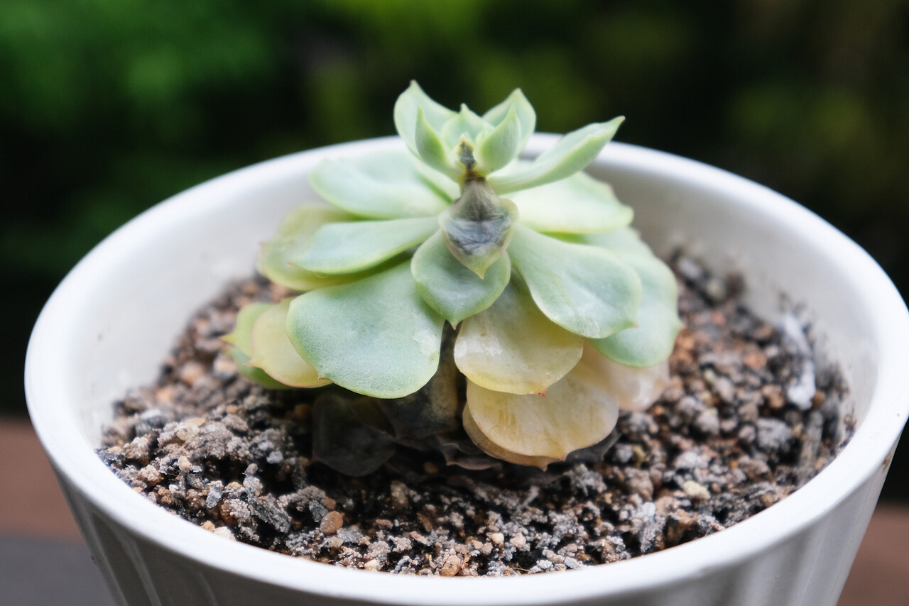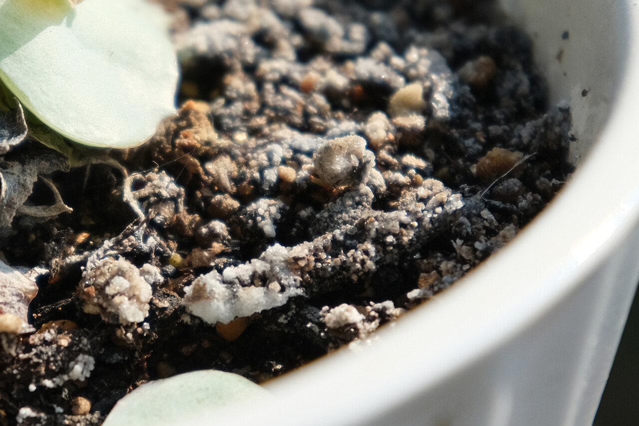 ピンボケでわかりづらいが、土の表面に白いものがたくさんある。