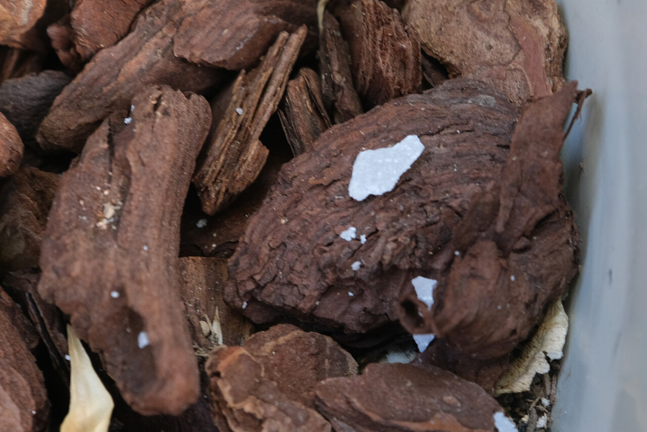 さらにベンジャミンのプランターに敷いてあるウッドチップにも、別の形状の白い破片のようなものがあるのを見つけた。これはどこかから剥がれ落ちたような感じである。まったく正体不明。