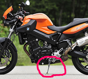 早速入院かと心配したが、結論を言えばサイドスタンド(写真のピンクのところ)を降ろしてある状態で、ギアを入れるとエンジンが止まるようになっているとのこと。つまりサイドスタンドを引きずって走らないための安全対策。35年前には、そんな仕掛けはなかったよう〜