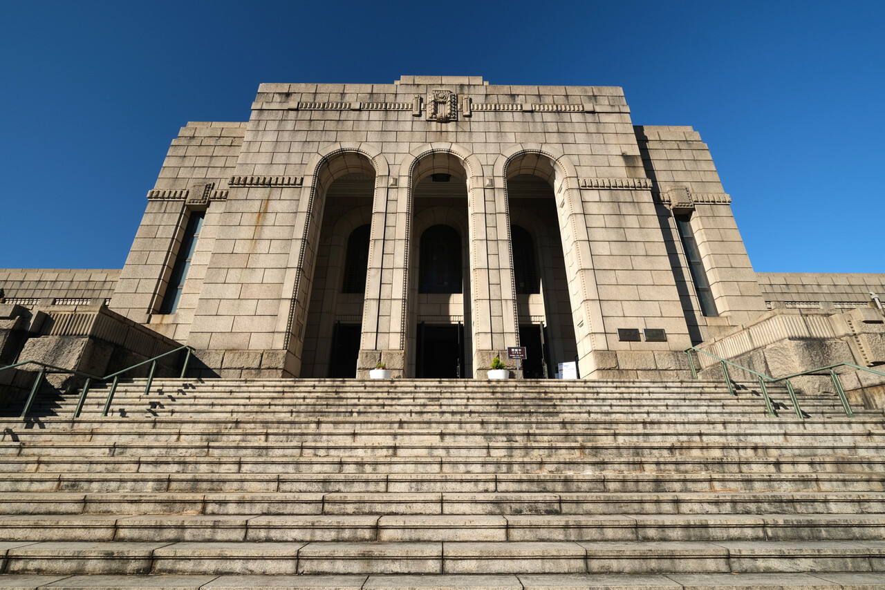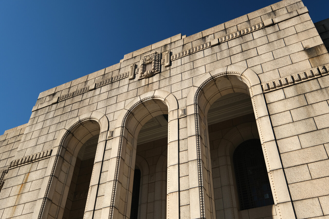 1926年(大正15年)に建設されたクラシックな建物。理由は知らないが、なぜか窓がないので異様な外観である。