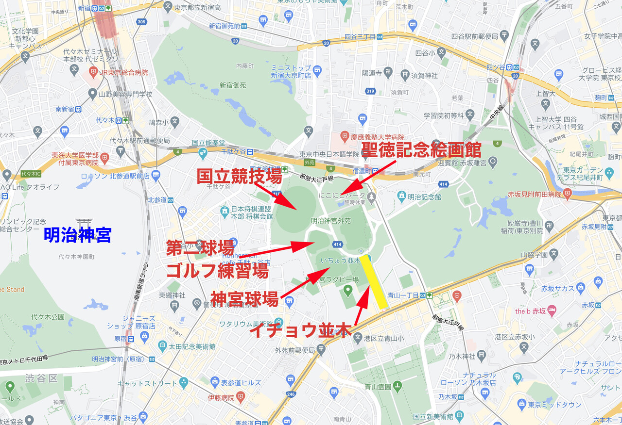 地図で黄色く塗ったイチョウ並木を眺めて、神宮球場を横目で見ながら国立競技場まで歩いたのが前回のエントリー。現在位置は地図に「明治神宮外苑」と書かれている「神」の文字の上にある交差点。