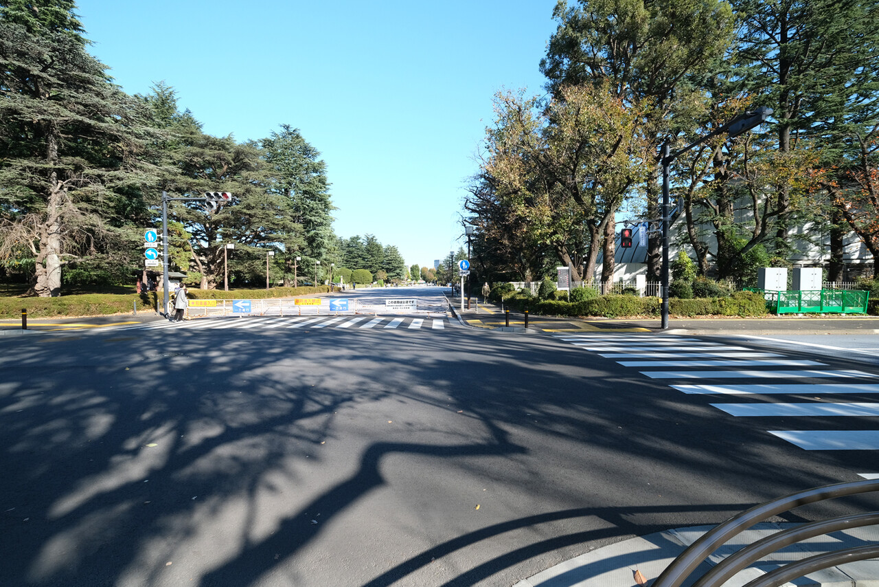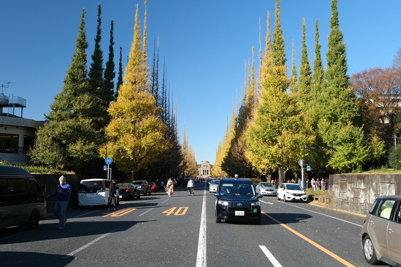 絵画館の東出入り口を抜けて、周回道路でイチョウ並木に戻る。