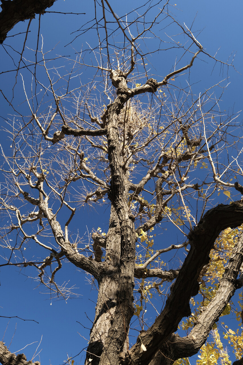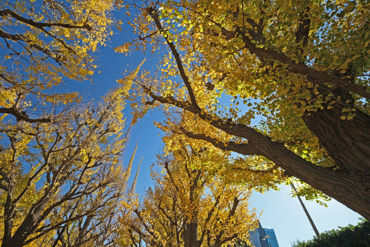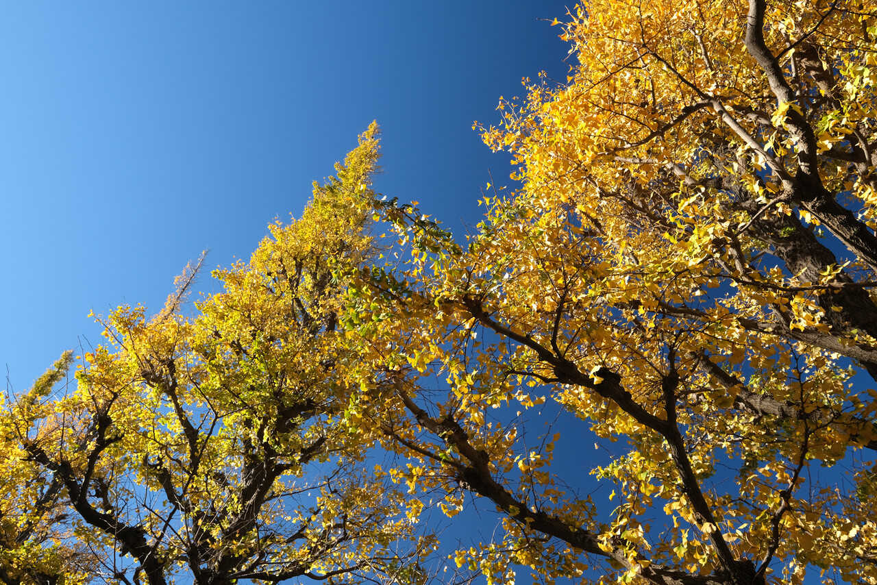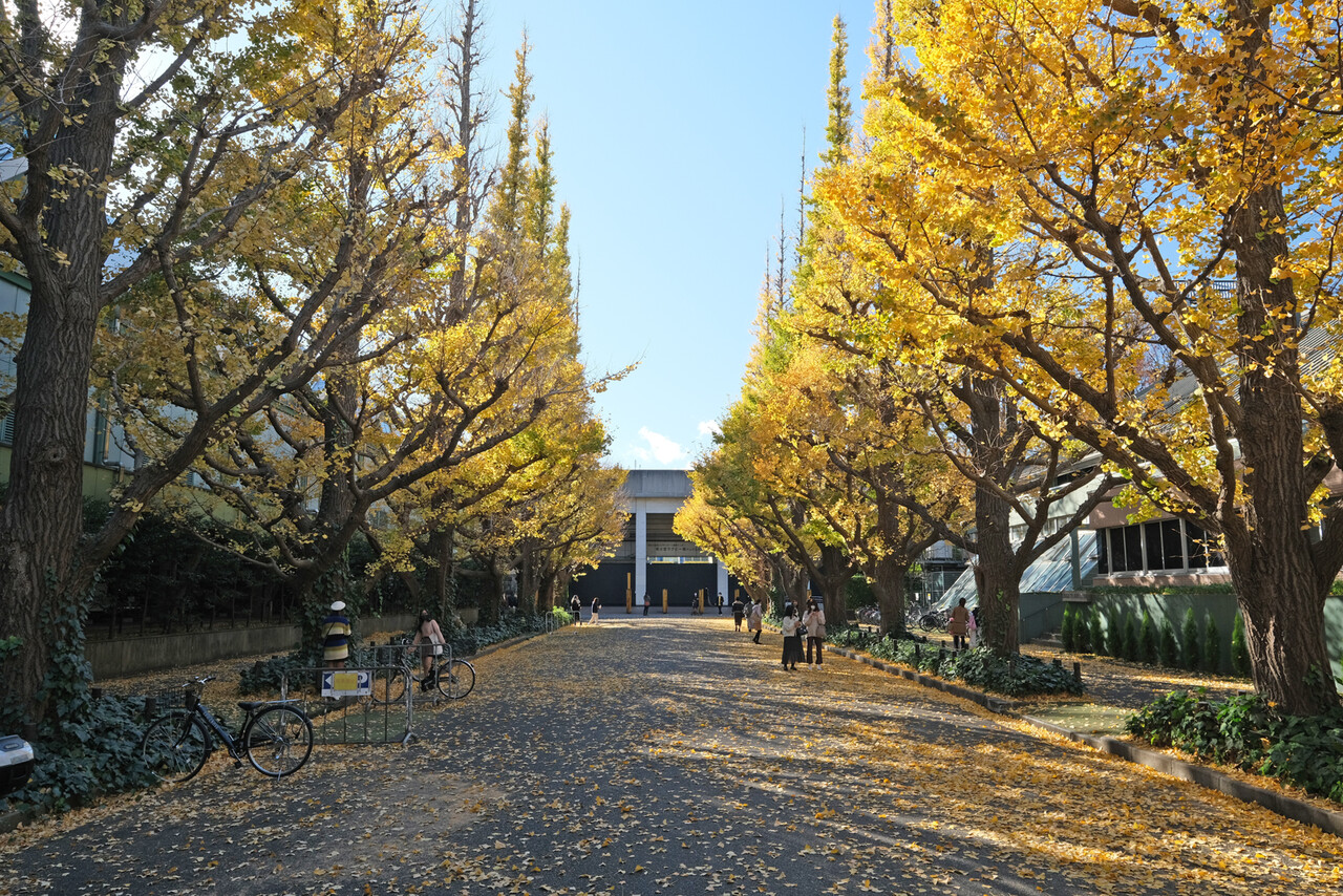 メインの並木から横にそれる通路は人が少なくて、ゆっくりイチョウを眺められる。正面に見えているのは秩父宮ラグビー場のスタンド。