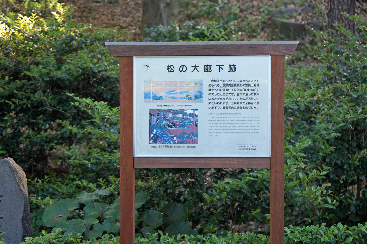 皇居にある3つの公園のひとつ、皇居東御苑はかつて江戸城の本丸などがあった場所。そこを散策すると松の廊下跡コッチの案内板がある。