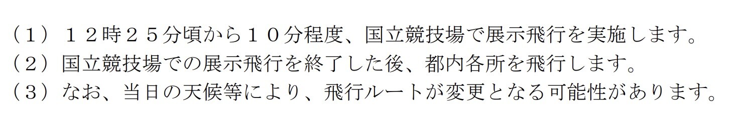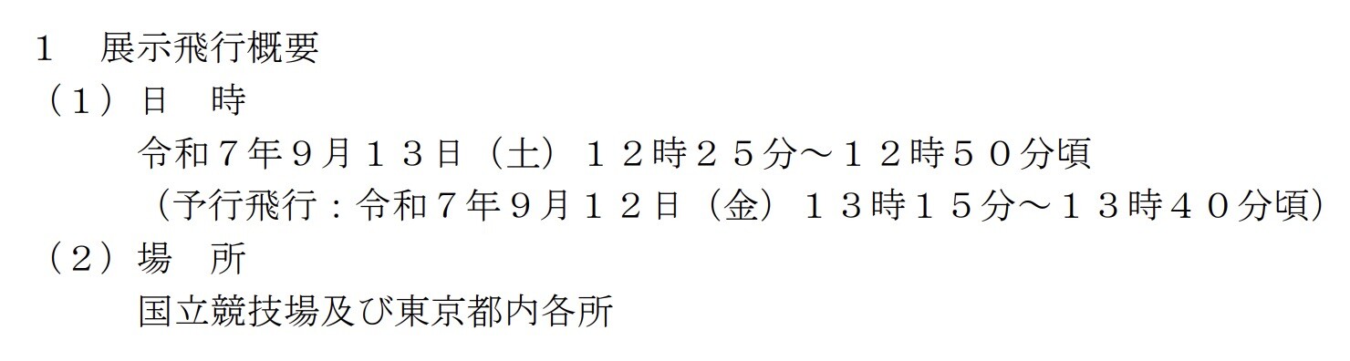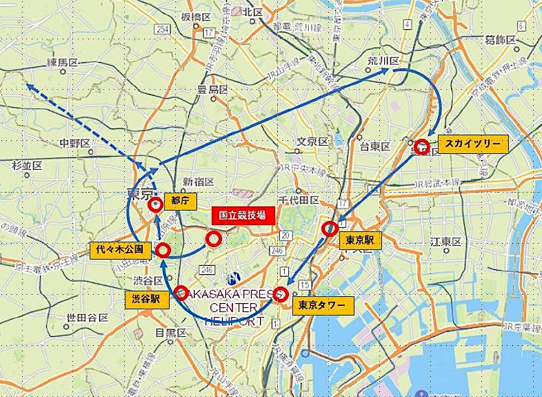 これは国立競技場上空ではアクロバティックな飛行を披露し、それ以外の都内各所では単にそこを通るだけとの意味なのかな。そう考えると見るべき場所は国立競技場。しかし競技場周辺の道路は激混みしそうだ。