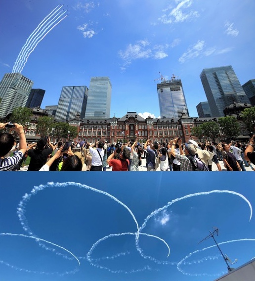 東京駅上空の飛行と五輪マークをスモークで描いているブルーインパルス。画像はhttps://x.gd/T88PBとhttps://x.gd/6ZLcC(短縮URL使用)から引用編集