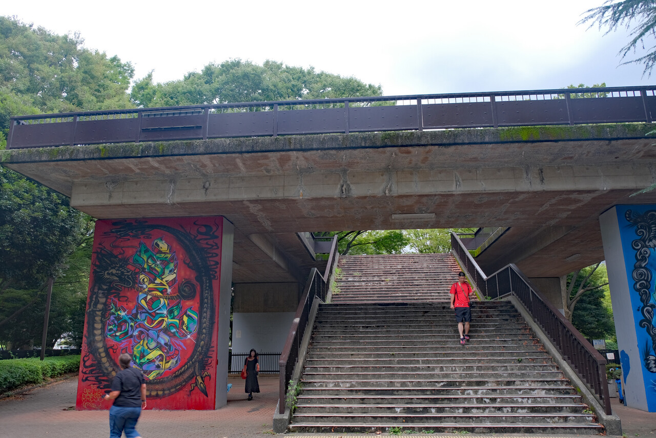 展望デッキの入り口。展望デッキといっても代々木公園のメイン敷地から離れて、NHK側にあるイベント広場に向かう歩道橋である。まあ普通の歩道橋よりは広いが。