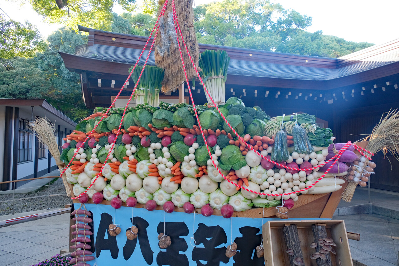 その脇に野菜で作った宝船が。
