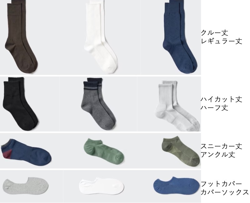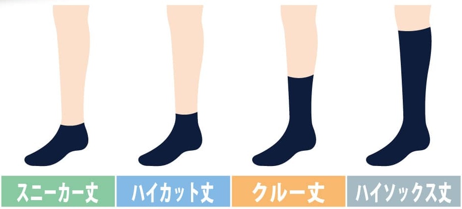上のイラストからハイソックスを除いた商品写真。名前はメーカーによってまちまちでクルーをレギュラー、ハイカットをハーフ、スニーカーをショートあるいはアンクル丈と呼んだりもする。ちなみにスニーカーソックスというのはレナウンの登録商標。画像はhttps://x.gd/Fkov5(短縮URL使用)から引用編集。次の写真も同様。
